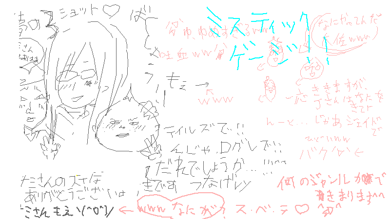 昨日から今日に掛けて絵茶室に籠もっていましたら、とある方が乱入室してくださいました笑 その名も帝王さん!! まぁ二言目には私、正体分かってましたが^^^^^ 女帝ネタ知ってる人はあんまり知りませんのよ!\(^O^)/ で、カオスになった↓ 原寸クリックしてください^p^ 本当はフジキ君がはじっこに居ましたwww ピンク&水色は私で、灰色&下のほうの『ス・ベ・テv』は帝王さんです^^ 夢のスリーショットですよ!果てし無く要りませんが(^ω^) 因みに私が一人だけだった時に描いたカオスログは、あんまりにあんまりだったので全消ししてしまって残ってません/(^p^)\残せるかあんなもの! この前ひっそり私が絵茶室に籠もってた時のログは↓ NA NI GA KA KI TA I! 狂ってました。